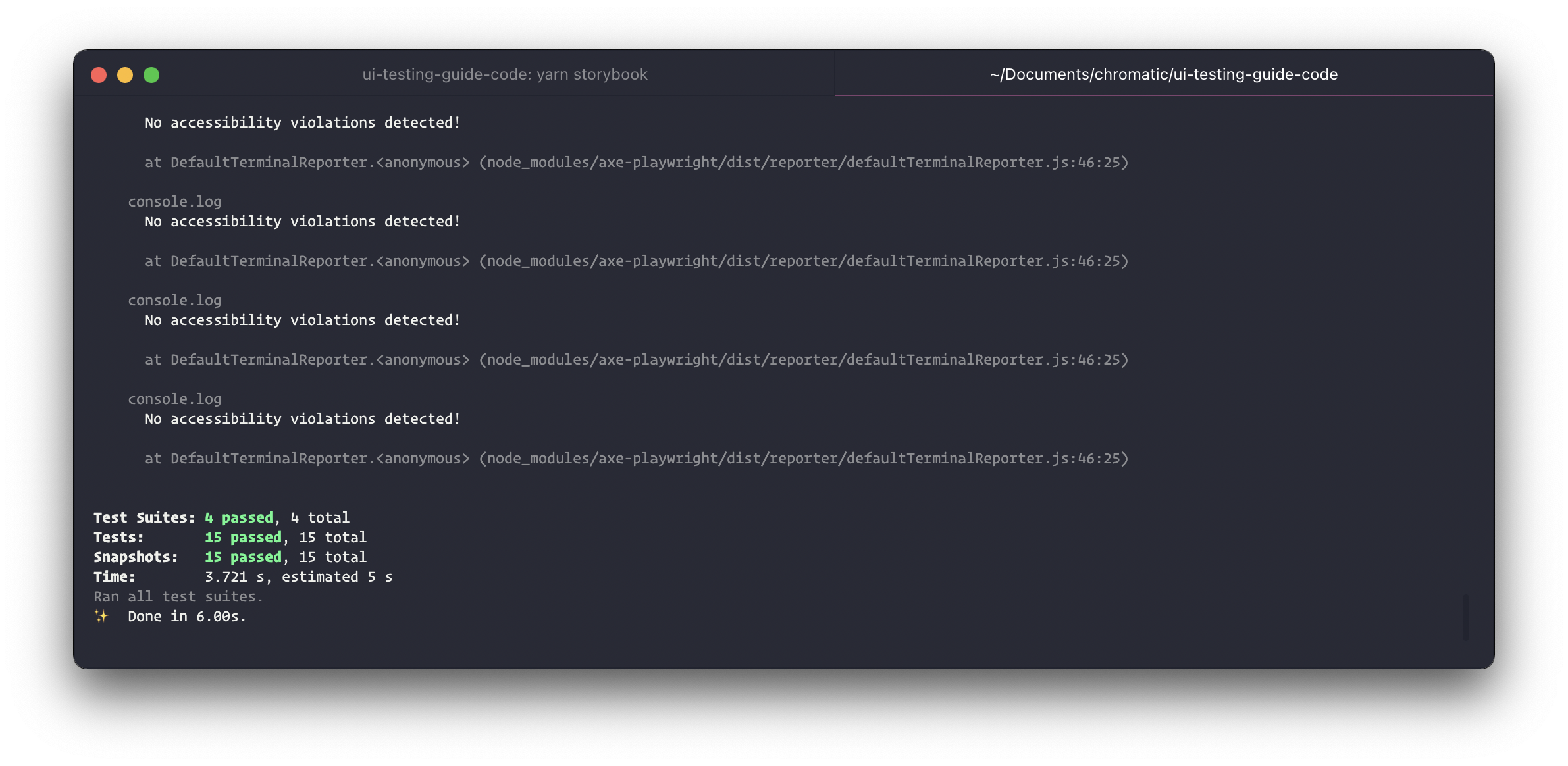 To run the tests, start your Storybook in one terminal window with yarn storybook and the test runner in another with yarn test-storybook.
