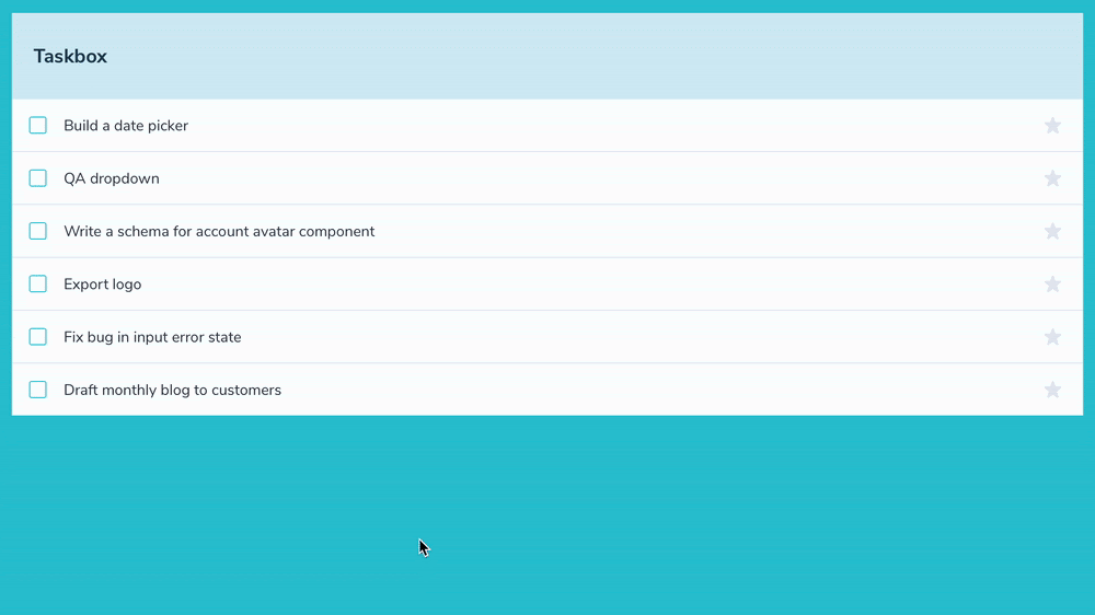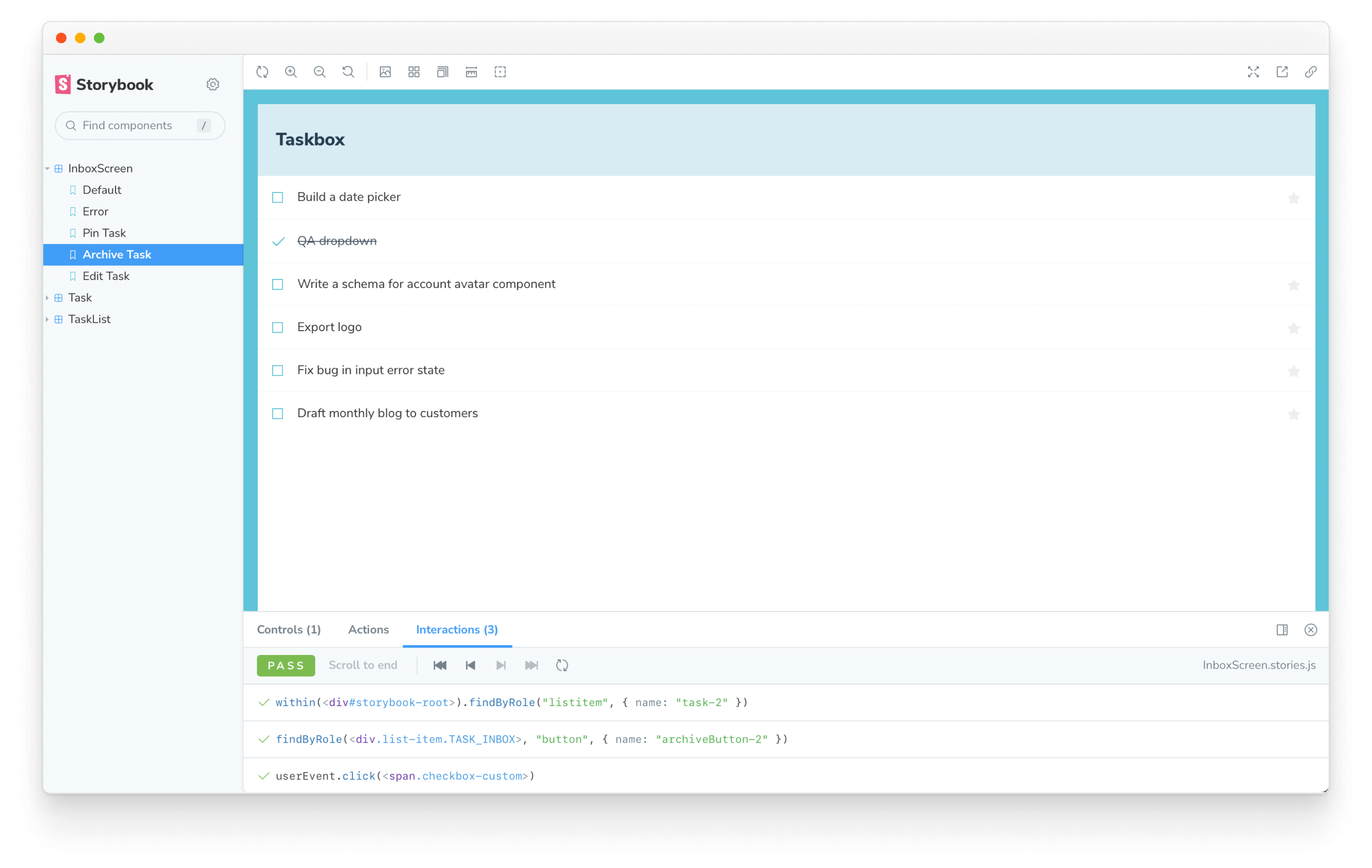 , the user can click on the star icon to pin a task. Or click on the checkbox to archive it. Visual tests ensure that the component looks right in all those states. We also need to ensure that the UI is responding to those interactions correctly.