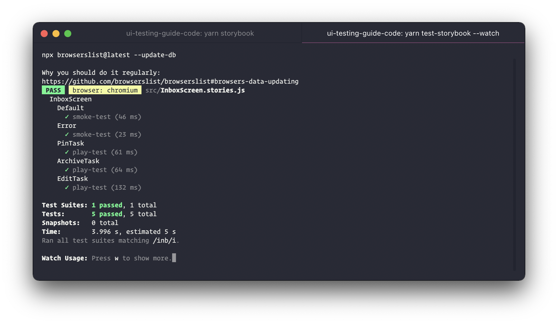 It'll verify whether all stories rendered without any errors and that all assertions are passed. If a test fails, you get a link that opens up the failing story in the browser.