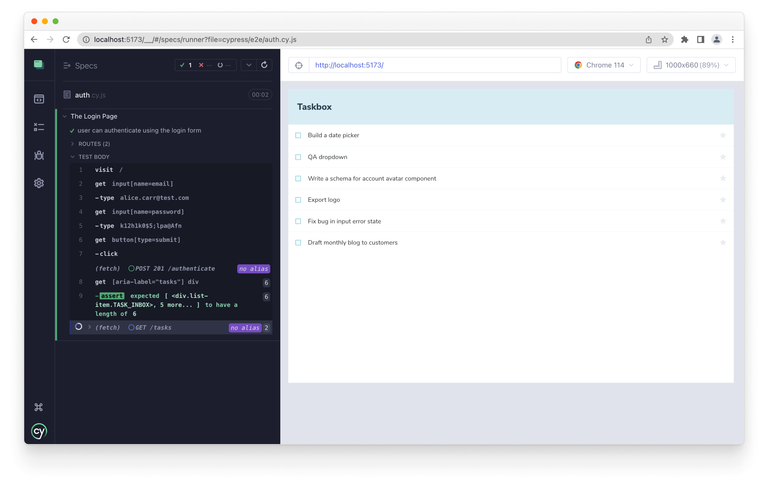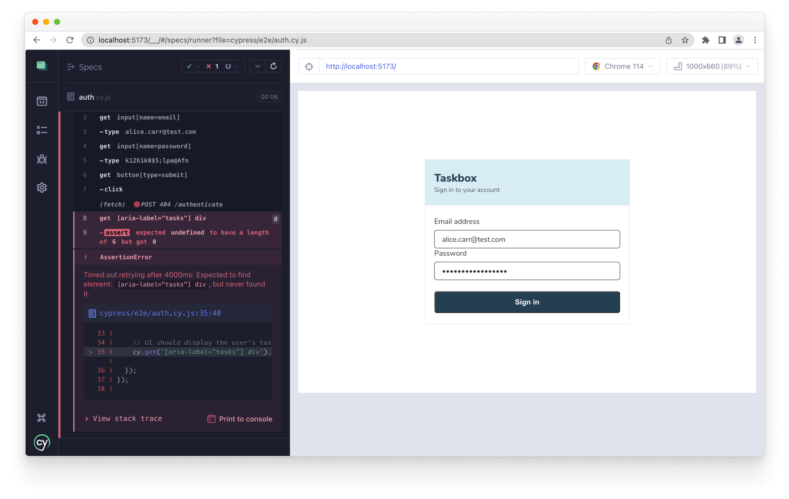 We’ll write an E2E test for the authentication flow: navigate to the login page and fill in the user credentials. Once authenticated, the user should be able to see a list of their tasks.