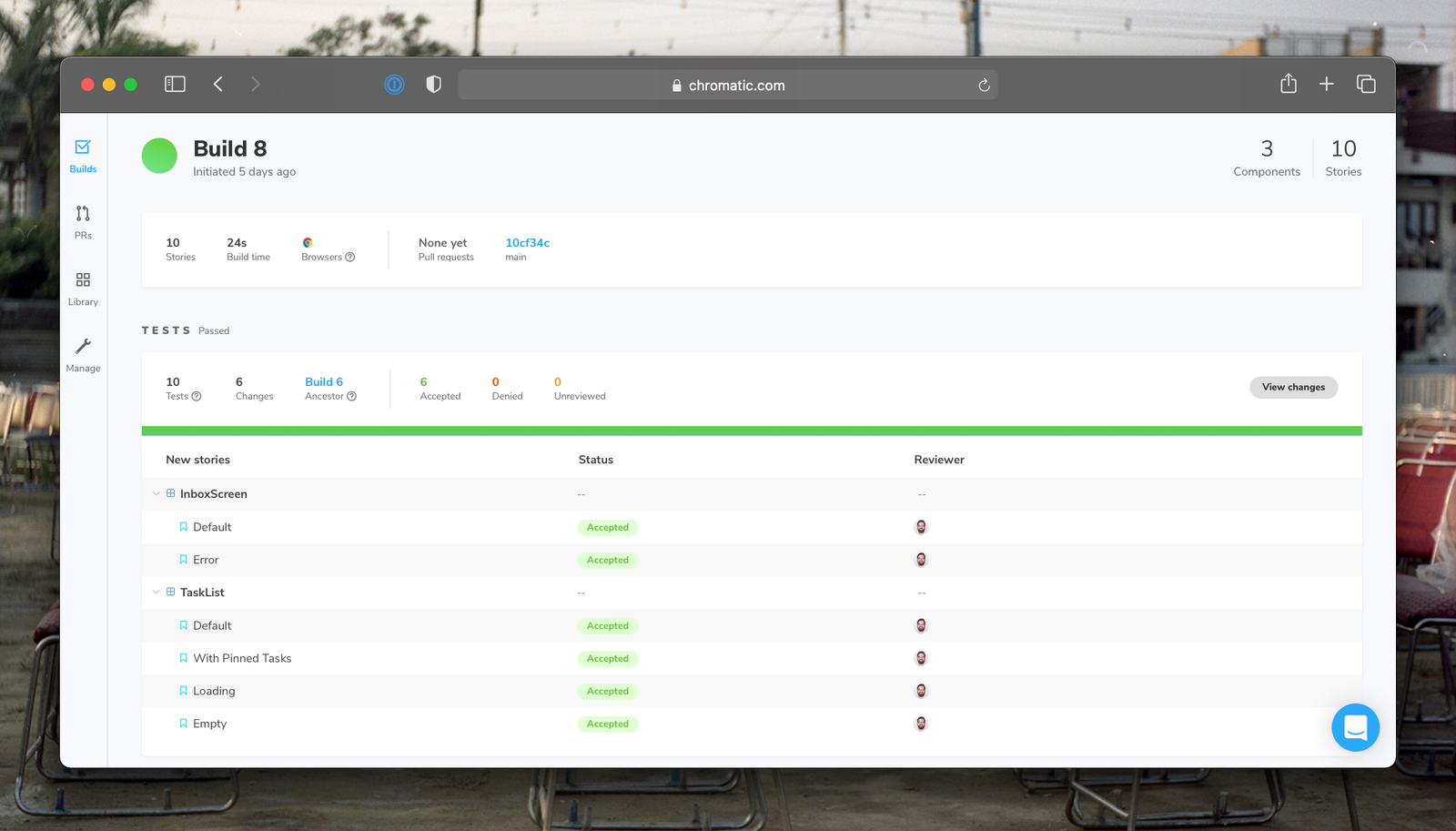 이전 장에서 크로마틱(Chromatic)을 설정하고 기본적인 작업 흐름을 살펴보았습니다. 이제 모든 복합 컴포넌트에 대한 스토리가 있으므로, 아래 명령어로 시각적 테스트를 실행할 수 있습니다.