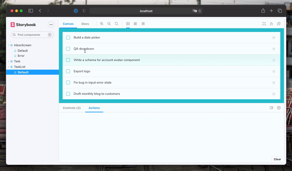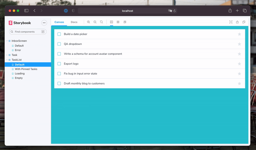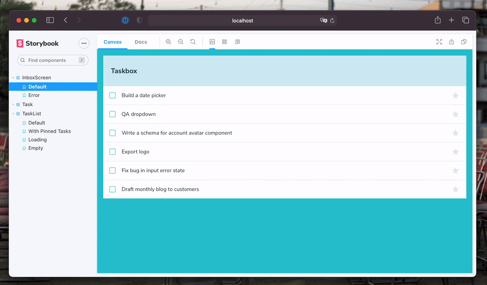 InboxScreen커스텀 훅을 사용해서 Taskbox API에서 데이터를 가져오고 애플리케이션의 상태를 관리합니다. 단위 테스트를 할 때처럼 실제 백엔드로부터 컴포넌트를 분리하고 기능별로 테스트해봅시다.